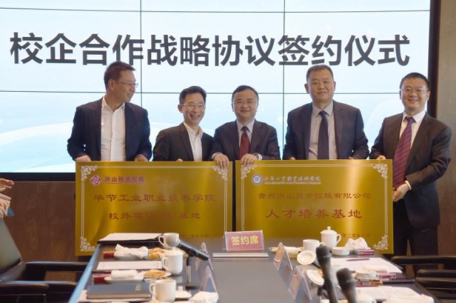 隨后,貴州洪山投資控股有限公司董事長金烈森和學院院長邱國援簽訂了校企合作戰(zhàn)略協(xié)議書,并完成授牌儀式。