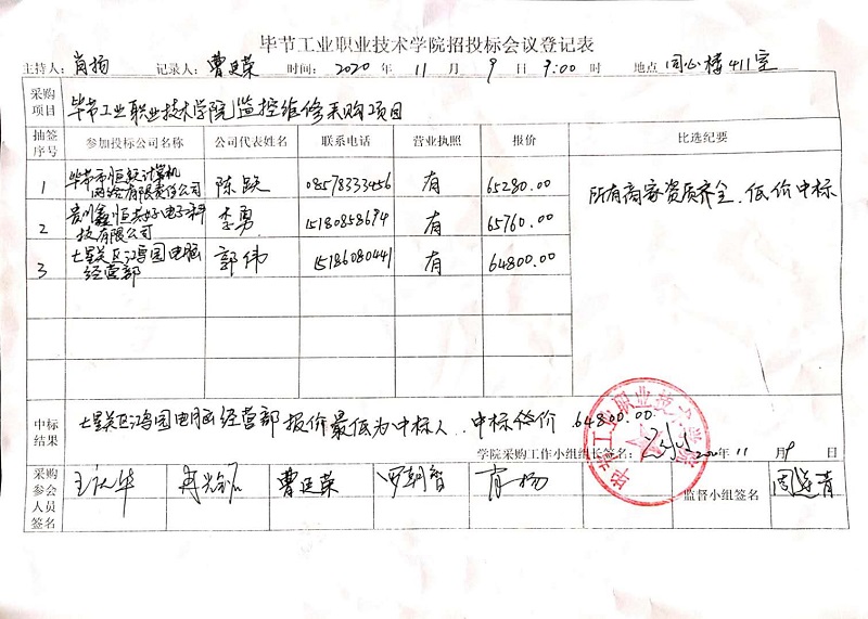 畢節(jié)工業(yè)職業(yè)技術(shù)學(xué)院監(jiān)控維修采購項目中標公告