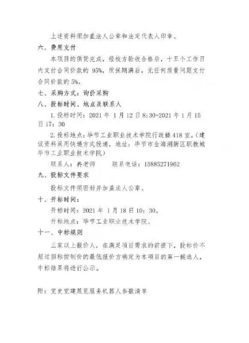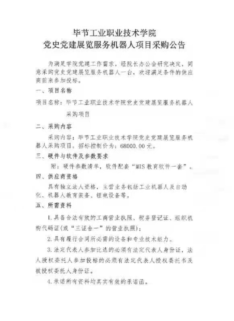 畢節(jié)工業(yè)職業(yè)技術(shù)學(xué)院黨史黨建展覽服務(wù)機器人項目采購公告