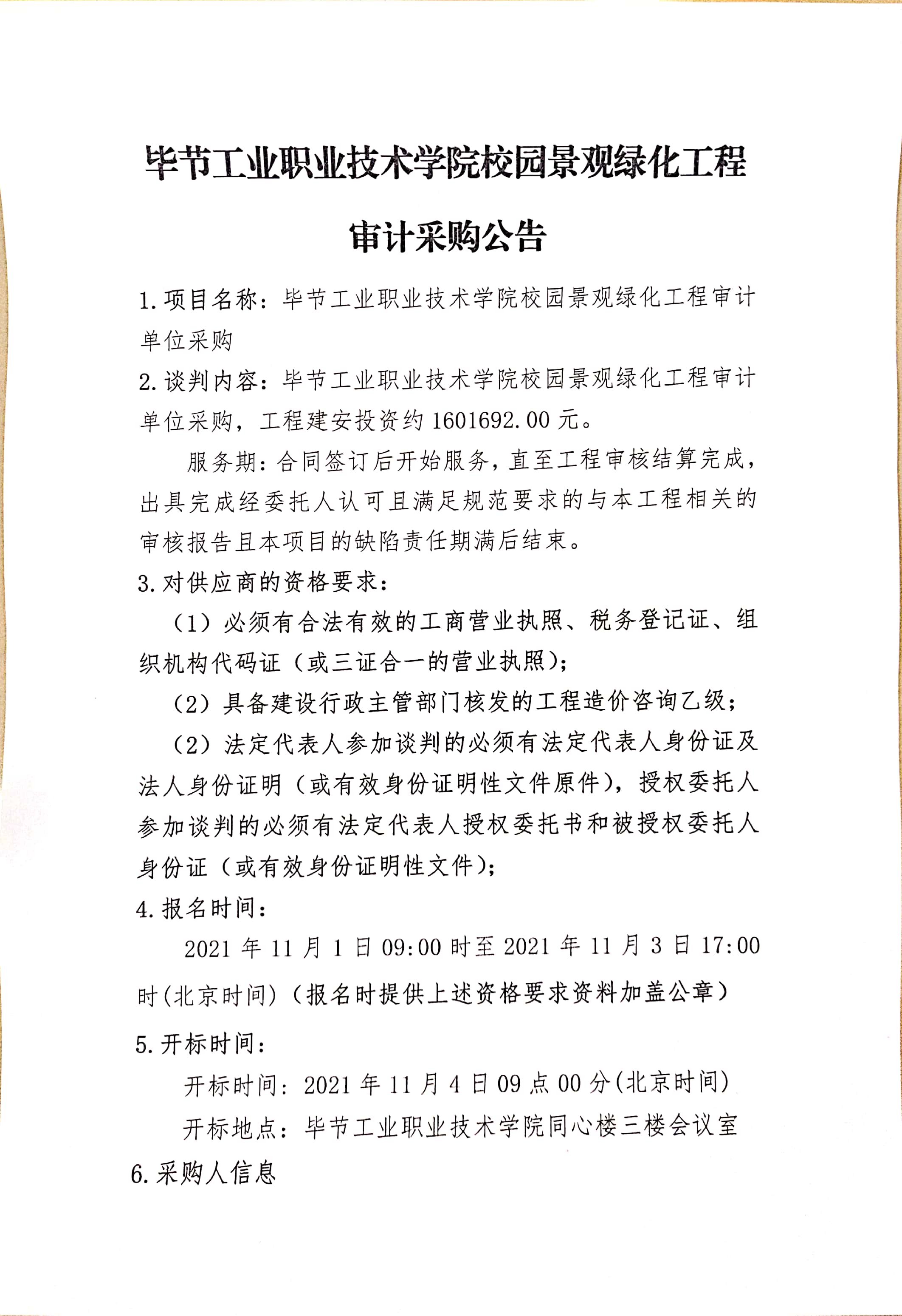 畢節(jié)工業(yè)職業(yè)技術(shù)學(xué)院校園景觀綠化工程審計(jì)采購(gòu)公告