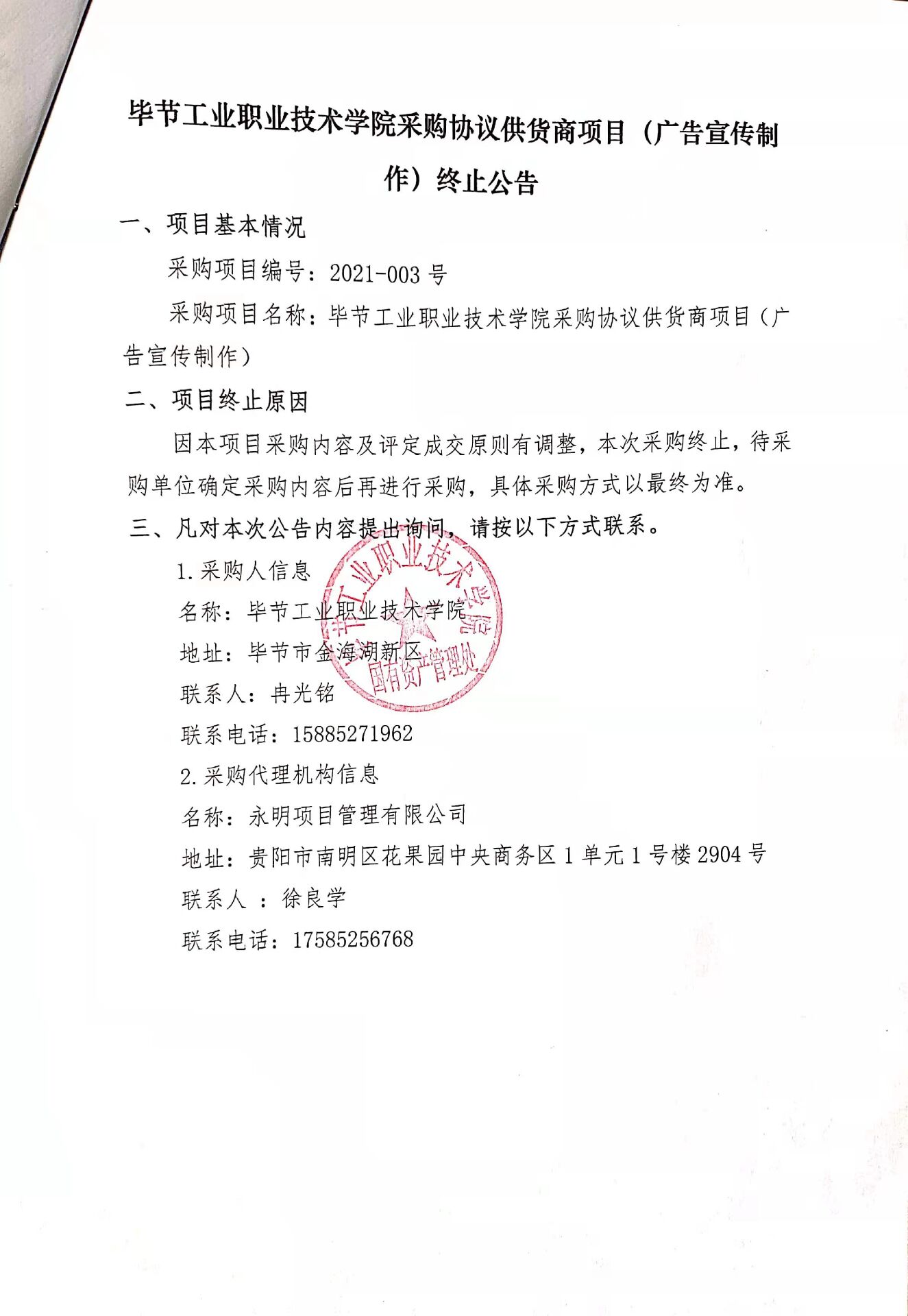 畢節(jié)工業(yè)職業(yè)技術學院采購協(xié)議供貨商項目(廣告宣傳制作)終止公告
