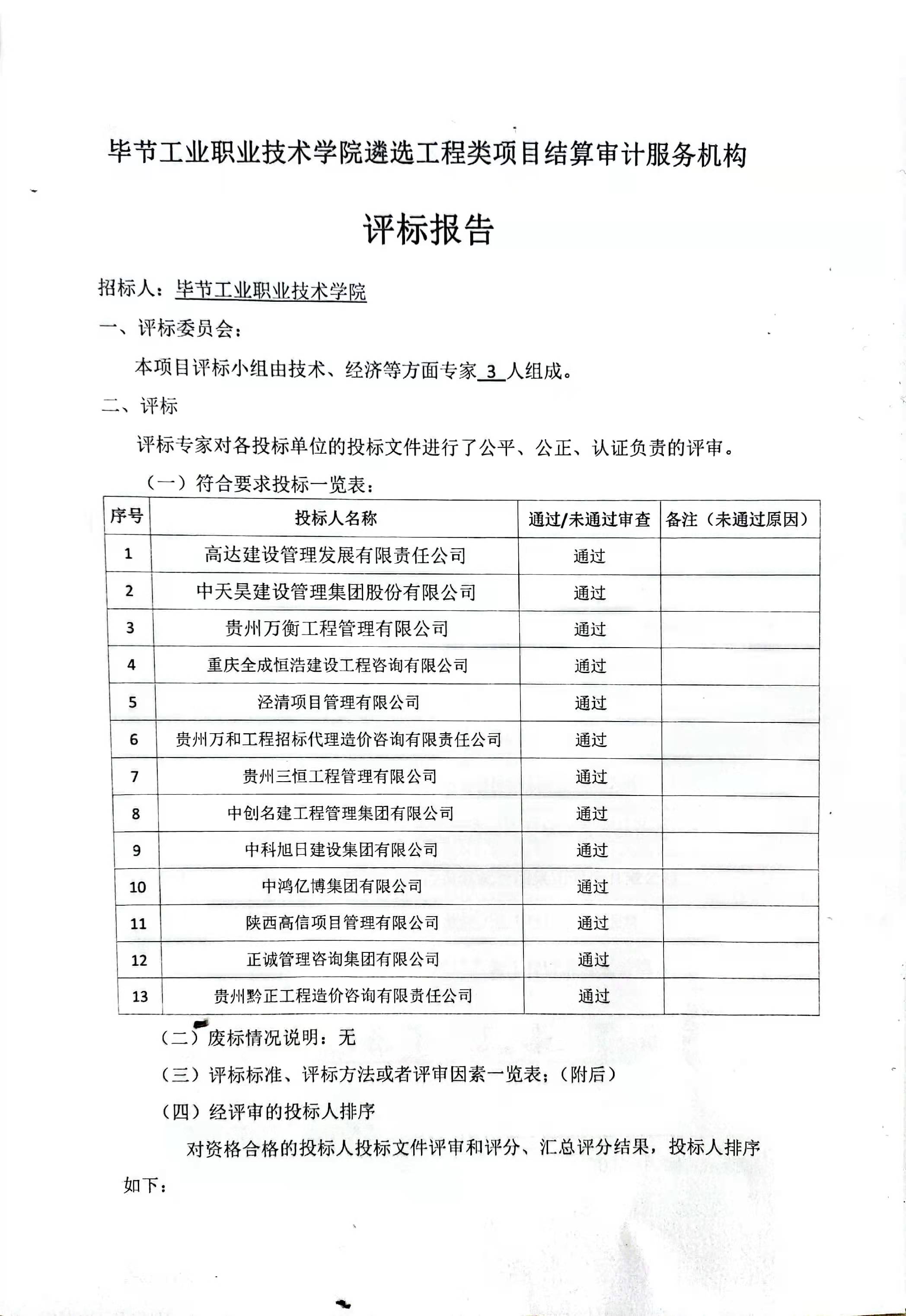 畢節(jié)工業(yè)職業(yè)技術(shù)學(xué)院遴選工程類項目結(jié)算審計服務(wù)機構(gòu)評價報告