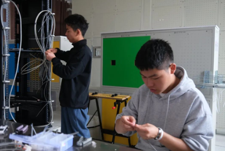 (楊建(左)宋洪宇(右)在實訓室認真?zhèn)滟悾?/span>
