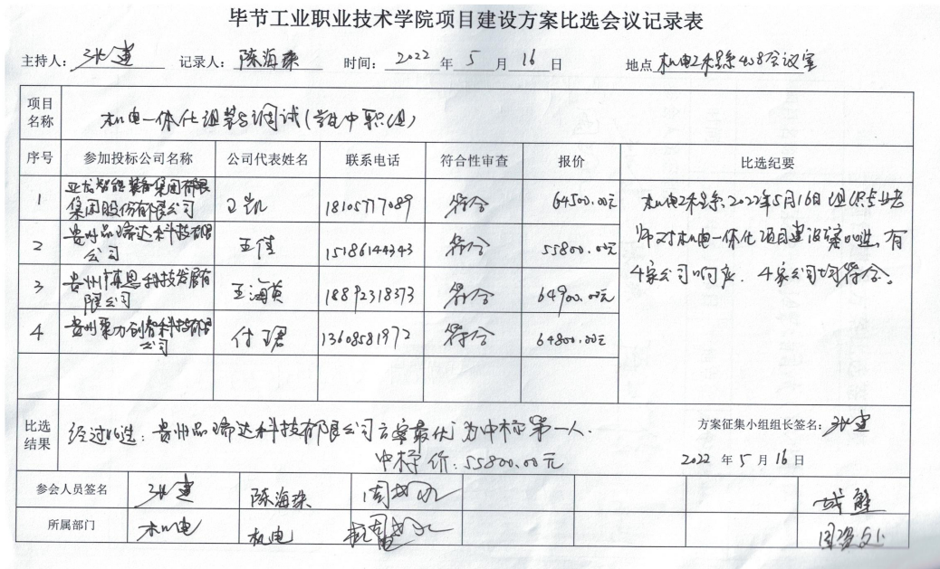畢節(jié)工業(yè)職業(yè)技術學院機電一體化(中職組)省賽設備設備項目征集方案比選結果公示