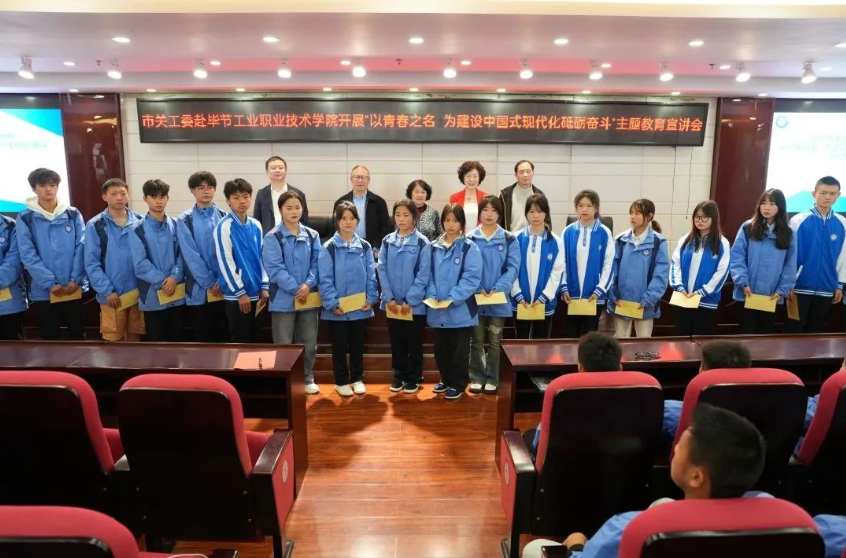 4月28日,畢節(jié)市關工委主任周長琦、副主任杜娟、謝正發(fā)、潘軍偉一行赴我院開展主題教育宣講并實地調(diào)研我院辦學情況。學院黨委委員、副院長吳家文,黨委委員、組織部長申開谷,工會、婦聯(lián)主席李淑文及相關部門人員陪同調(diào)研。宣講會由吳家文主持,學院師生代表200余人聆聽宣講。