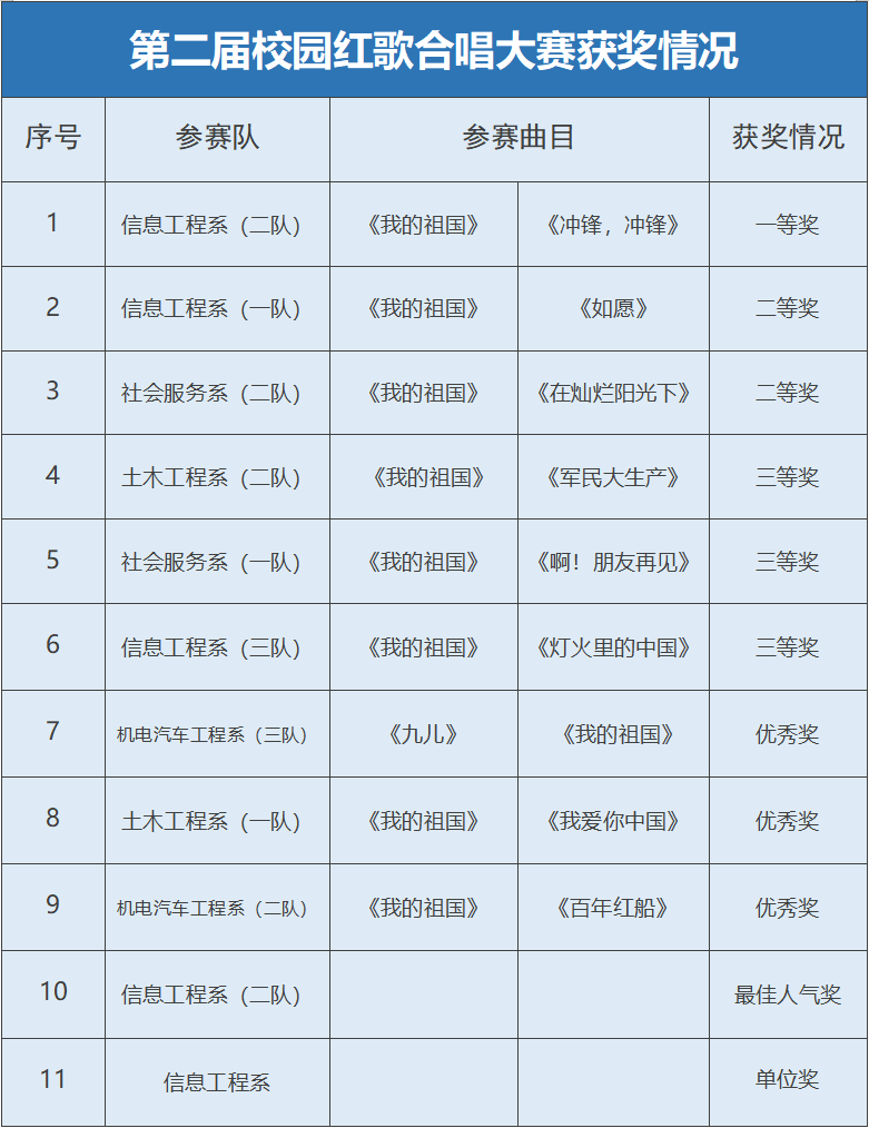 5月31日晚 學(xué)院多功能廳 上演了一場(chǎng) 精彩的紅歌合唱大賽 (信息工程系一隊(duì)) (社會(huì)服務(wù)系二隊(duì)) (土木工程系二隊(duì)) (社會(huì)服務(wù)系一隊(duì)) (信息工程系三隊(duì)) (機(jī)電汽車工程系三隊(duì)) (土木工程系一隊(duì)) (機(jī)電汽車工程系二隊(duì)) 雄渾的歌聲 整齊的隊(duì)伍 一個(gè)個(gè)滿腔熱血的學(xué)子 展現(xiàn)著積極昂揚(yáng)的風(fēng)貌 一曲曲波瀾起伏的合唱 唱出了祖國(guó)胸懷之豪邁 他們用充滿激情的歌聲 詮釋了工職院學(xué)子 青春的熱血和飽滿的精神 此次大賽的成功舉辦 不僅豐富了同學(xué)們的文化生活 更在整個(gè)校園形成了 愛(ài)黨愛(ài)國(guó)的濃厚氛圍 最后 在評(píng)委們公正公平的評(píng)選下 誕生了此次大賽的各個(gè)獎(jiǎng)項(xiàng)