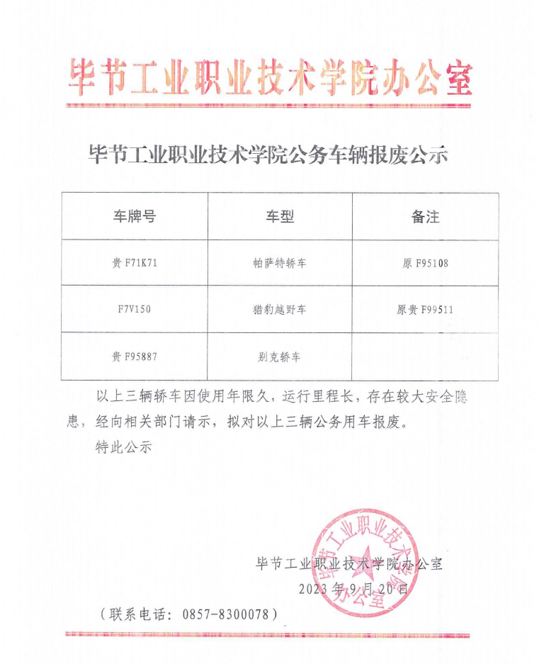 畢節(jié)工業(yè)職業(yè)技術(shù)學(xué)院公務(wù)車輛報(bào)廢公示
