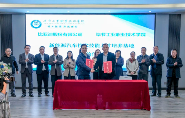 11月10日,畢節(jié)工業(yè)職業(yè)技術(shù)學(xué)院與比亞迪汽車股份有限公司、行云新能科技(深圳)有限公司開展“比亞迪新能源汽車技術(shù)技能人才培養(yǎng)基地”簽約儀式。學(xué)院黨委副書記、院長(zhǎng)邱國(guó)援,畢節(jié)市教育局黨組成員、副局長(zhǎng)金莉,比亞迪西南地區(qū)人力資源總監(jiān)蔣平,行云新能科技(深圳)有限公司副總經(jīng)理王克靜出席儀式。學(xué)院、比亞迪、行云新能相關(guān)領(lǐng)導(dǎo)及學(xué)院汽車工程系師生代表參加儀式。儀式由學(xué)院黨委委員、副院長(zhǎng)吳家文主持。