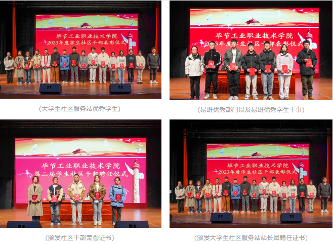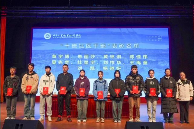 黃文碧在講話中指出,希望獲得表彰的同學以及新聘任的社區(qū)干部戒驕戒躁,提高認識,增強責任感和使命感,認真履職,確保各項工作有序開展,密切配合,勤于學習、大膽實踐,形成強大工作合力,胸懷大局意識、服務意識和奉獻意識,認真履行好學生社區(qū)管理服務工作職責,爭取再創(chuàng)佳績,為校園做出新的更大的貢獻。 (黨委委員、副院長黃文碧講話) 會上,學生工作處負責人胡永祚宣讀了《關(guān)于表彰2023年易班優(yōu)秀學生干事、優(yōu)秀部門的決定》和新一屆社區(qū)干部任命決定、大學生社區(qū)服務站聘任名單;心理健康教育與咨詢中心負責人周靜宣讀表彰2023年“十佳社區(qū)干部”,大學生社區(qū)服務站優(yōu)秀站長、部長、干事決定。 (2022-2023學年度社區(qū)管理委員會“十佳社區(qū)干部”) 此次“一站式”學生社區(qū)干部表彰及學生社區(qū)干部聘任儀式的舉行,為我院學生社區(qū)管理工作注入了新的活力,也標志著學院在學生社區(qū)建設方面邁上了新的臺階。今后,學院將進一步推進“金海學堂”學生社區(qū)建設,規(guī)范社區(qū)學生自主管理,切實增強學生社區(qū)管理服務人員的責任感與使命感,以全新的思路和行動,打造出要畢節(jié)工職院特色的學生社區(qū)品牌。