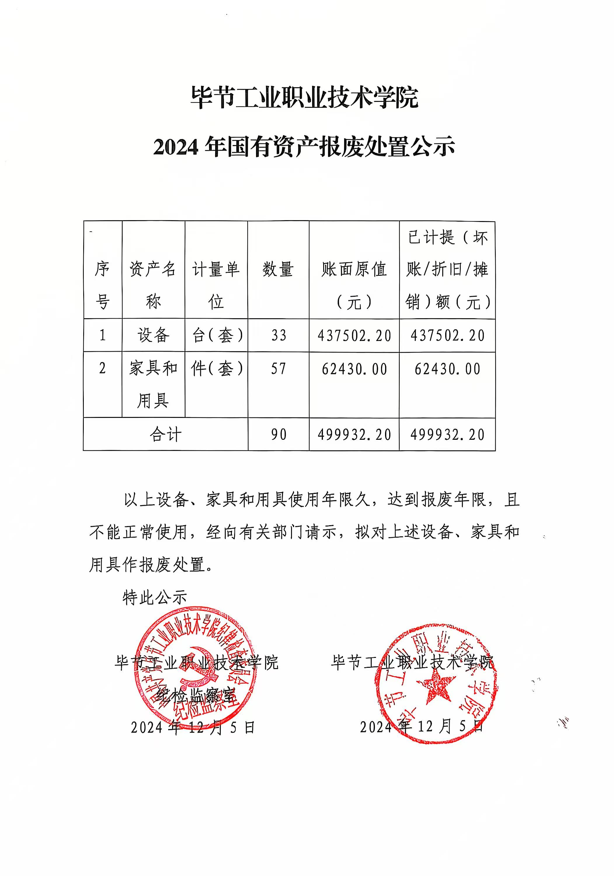 畢節(jié)工業(yè)職業(yè)技術(shù)學院2024年國有資產(chǎn)報廢處置公示