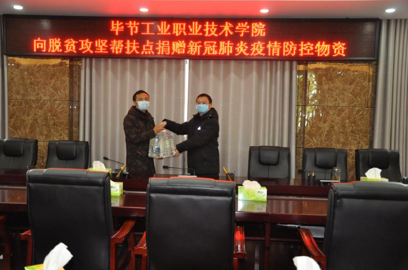 2月21日,畢節(jié)工業(yè)職業(yè)技術(shù)學(xué)院黨委委員、副院長吳家文同志代表學(xué)院向脫貧攻堅(jiān)幫扶點(diǎn)安樂溪鄉(xiāng)、可樂鄉(xiāng)各捐贈(zèng)醫(yī)用消毒酒精300斤。安樂溪鄉(xiāng)、可樂鄉(xiāng)工作人員對(duì)學(xué)院給予的關(guān)心和幫助致以謝意并表示學(xué)院在特殊時(shí)期向脫貧攻堅(jiān)幫扶點(diǎn)捐贈(zèng)新冠疫情防控物資,既體現(xiàn)了學(xué)院為助力脫貧攻堅(jiān),全面實(shí)現(xiàn)小康社會(huì)以及堅(jiān)決打贏疫情防控和脫貧攻堅(jiān)“兩場(chǎng)硬戰(zhàn)”所做的貢獻(xiàn),也充分發(fā)揮了職業(yè)院校服務(wù)社會(huì)的功能。