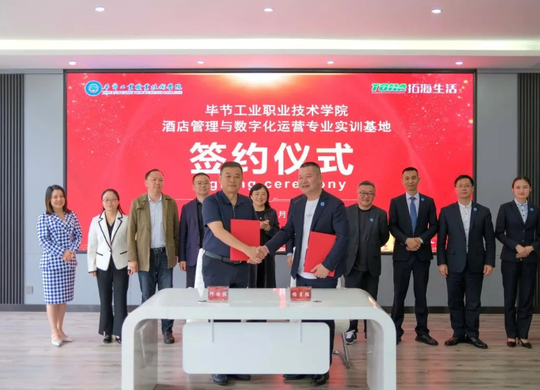 5月12日,畢節(jié)工業(yè)職業(yè)技術(shù)學(xué)院拓海學(xué)院一周年成立儀式暨畢節(jié)工業(yè)職業(yè)技術(shù)學(xué)院酒店管理與數(shù)字化運營專業(yè)實訓(xùn)基地簽約儀式在拓海學(xué)院會議室舉行。學(xué)院黨委副書記、院長邱國援,黨委委員、副院長黃瑛、黃河、吳家文、黃文碧,拓海學(xué)院名譽院長、拓海生活集團總裁楊月強,拓海學(xué)院院長林彬出席儀式,拓海集團相關(guān)領(lǐng)導(dǎo)、員工代表及學(xué)院社會服務(wù)系師生代表參加儀式。 儀式現(xiàn)場 邱國援在致辭中指出,校企雙方共建拓海學(xué)院實訓(xùn)基地,為相關(guān)專業(yè)學(xué)生提供了理實一體化教學(xué)場地和實習(xí)實訓(xùn)平臺,改善了物業(yè)管理、酒店管理等專業(yè)的教學(xué)、實訓(xùn)條件,使我院辦學(xué)條件、人才培養(yǎng)體系和教學(xué)質(zhì)量得到不斷提高。同時,拓海集團積極參與物業(yè)管理專業(yè)人才培養(yǎng)方案修訂,從行業(yè)、企業(yè)角度提出了很多人才培養(yǎng)的意見建議,邀請行業(yè)專家來校講學(xué),親自授課,使學(xué)生專業(yè)知識得到有力提升,使物業(yè)管理專業(yè)人才培養(yǎng)體系更加符合行業(yè)需求。下一步,希望校企雙方繼續(xù)深化校企合作機制、持續(xù)擴大合作范圍、協(xié)同提升合作質(zhì)量,充分發(fā)揮拓海生活服務(wù)集團在物業(yè)管理方面的專業(yè)優(yōu)勢,在人才培養(yǎng)方案、課程教學(xué)、實習(xí)實訓(xùn)、教師培養(yǎng)等方面提供企業(yè)建議和技術(shù)指導(dǎo),在教育教學(xué)、學(xué)生管理、素質(zhì)培養(yǎng)、技能提升等方面與學(xué)院交換經(jīng)驗,提升教師專業(yè)素質(zhì),強化學(xué)生技能提升,推進“工學(xué)結(jié)合”教學(xué)模式,共同提高學(xué)院育人質(zhì)量。 邱國援在儀式上致辭 楊月強表示,過去一年,校企雙方本著優(yōu)勢互補、資源共享、互惠雙贏、共同發(fā)展的原則,對校企合作模式進行了深層次的探索、創(chuàng)新與實踐,拓海學(xué)院的成立不僅推動了產(chǎn)教融合,也為學(xué)生提供了優(yōu)質(zhì)的實訓(xùn)基地,為企業(yè)提供了強有力的人才保障。下一步,企業(yè)將繼續(xù)聯(lián)手學(xué)院不斷創(chuàng)新,共同培養(yǎng)高素質(zhì)技術(shù)技能型人才,構(gòu)建校企合作雙贏局面,助推職業(yè)教育改革和地方經(jīng)濟社會高質(zhì)量發(fā)展。 楊月強在儀式上講話 儀式上,邱國援代表學(xué)院與拓海生活集團簽訂了《畢節(jié)工業(yè)職業(yè)技術(shù)學(xué)院酒店管理與數(shù)字化運營專業(yè)實訓(xùn)基地(中心)建設(shè)合作協(xié)議》。學(xué)院與拓海生活集團將再次攜手,共建畢節(jié)工業(yè)職業(yè)技術(shù)學(xué)院酒店管理與數(shù)字化運營專業(yè)實訓(xùn)基地,共同承擔(dān)科研項目、實現(xiàn)信息共享,培養(yǎng)更多高質(zhì)量的技能人才,為畢節(jié)全面推進鄉(xiāng)村振興提供有力的人才支撐。 簽約儀式現(xiàn)場 拓海學(xué)院院長林斌、社會服務(wù)系主任呂振欣為優(yōu)秀學(xué)生羅達麗、李定奎頒發(fā)榮譽證書 優(yōu)秀學(xué)生代表羅達麗發(fā)言 儀式中的精彩節(jié)目
