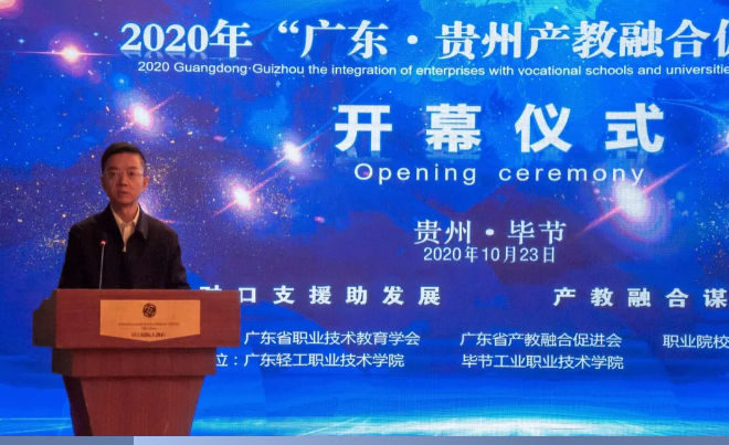 10月23日,廣東?貴州產(chǎn)教融合促進(jìn)大會(huì)在畢節(jié)隆重召開。廣東省教育廳巡視員朱俊文,貴州省教育廳一級(jí)巡視員鞠洪出席會(huì)議并致辭,畢節(jié)市委常委、副市長(zhǎng)胡愛斌致歡迎辭,廣東輕工職業(yè)技術(shù)學(xué)院黨委書記杜安國(guó)作介紹,會(huì)議由畢節(jié)工業(yè)職業(yè)技術(shù)學(xué)院黨委副書記、院長(zhǎng)邱國(guó)援全程主持。廣東省教育廳、貴州省教育廳、廣州市教育局、畢節(jié)市教育局相關(guān)負(fù)責(zé)人及參與產(chǎn)教融合大會(huì)的校企單位主要負(fù)責(zé)人參加會(huì)議。此次會(huì)議由廣東省職業(yè)技術(shù)教育學(xué)會(huì)、廣東省產(chǎn)教融合促進(jìn)會(huì)、職業(yè)院校協(xié)同發(fā)展聯(lián)盟主辦,廣東輕工職業(yè)技術(shù)學(xué)院、畢節(jié)工業(yè)職業(yè)技術(shù)學(xué)院承辦。