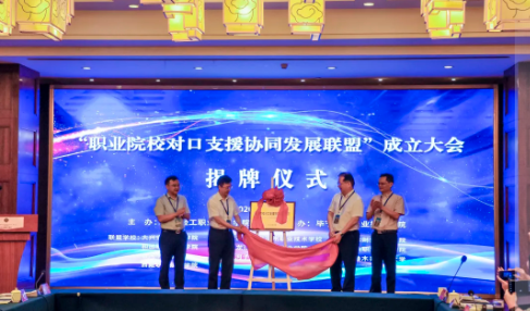 廣東省教育廳二級巡視員朱俊文,貴州省教育廳黨組副書記、副廳長鞠洪,畢節(jié)市人民政府副市長謝培午,廣東輕工職業(yè)技術(shù)學(xué)院黨委書記、廣東省職業(yè)技術(shù)教育學(xué)會會長杜安國,畢節(jié)工業(yè)職業(yè)技術(shù)學(xué)院黨委書記李涌一同出席聯(lián)盟成立大會并致辭,共同為“職業(yè)院校對口支援協(xié)同發(fā)展聯(lián)盟”揭牌。