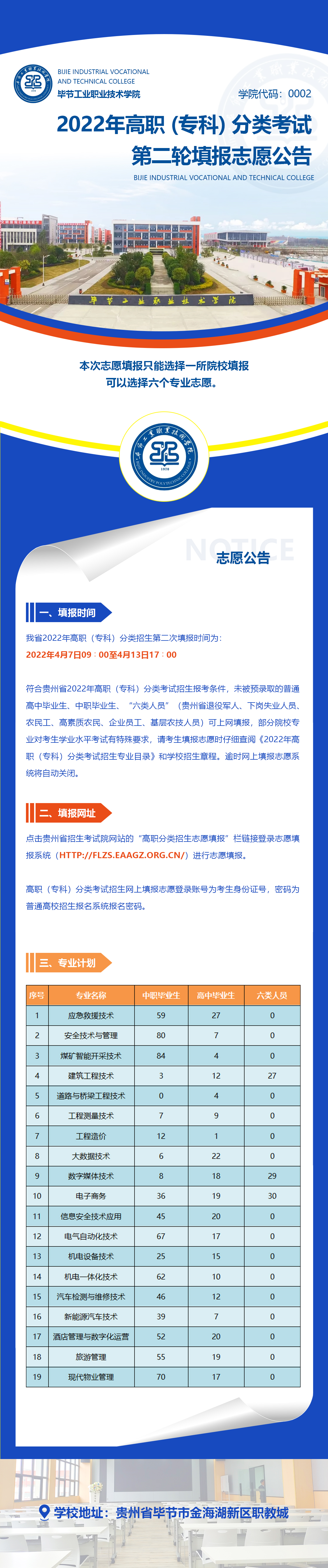 畢節(jié)工業(yè)職業(yè)技術(shù)學院2022年高職(專科)分類考試第二輪填報志愿公告